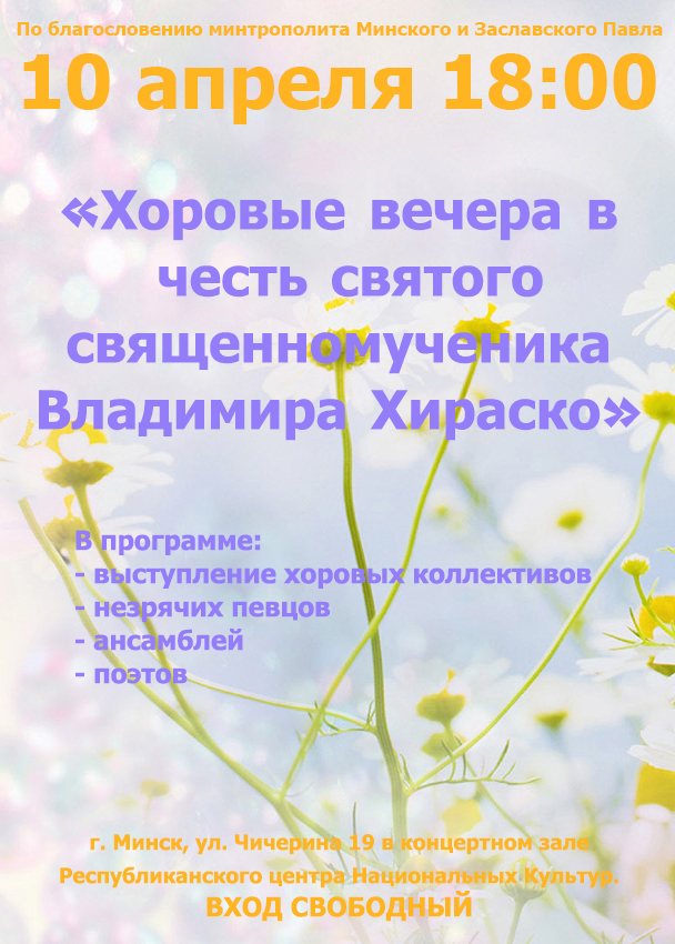 10 апреля 2016 года в Республиканском центре Национальных Культур (г. Минск) состоялся очередной концерт цикла "Хоровые вечера в честь святого священномученика Владимира Хираско", организованного по благословению митрополита Минского и Заславского Павла приходом в честь священномученика Владимира Хираско г. Минска. В рамках Года культуры Белорусская Православная Церковь совместно с Министерством культуры Республики Беларусь в течении года проводит ряд творческих мероприятий, посвященных новомученикам и исповедникам земли Белорусской.
