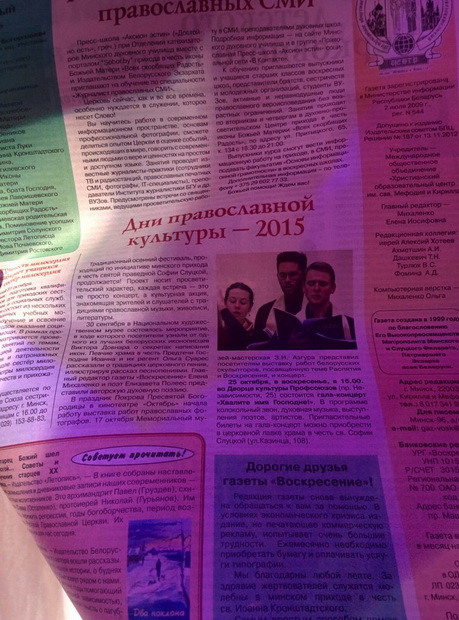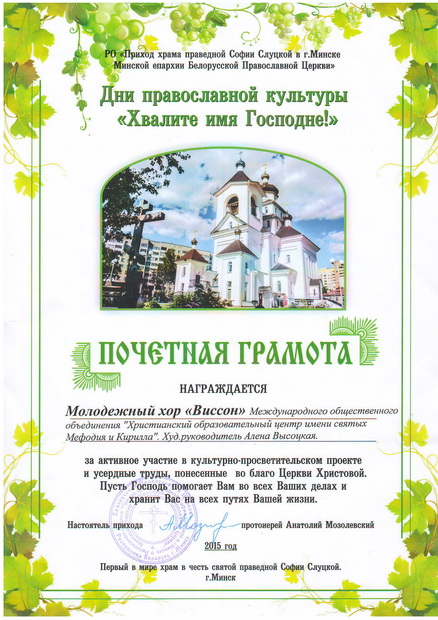 В сентябре-октябре 2015 года по благословению Его Высокопреосвященства Высокопреосвященнейшего Павла, Митрополита Минского и Заславского Патриаршего Экзарха всея Беларуси, прошли Дни православной культуры «Хвалите имя Господне!». Проект организован РО «Приход храма праведной Софии Слуцкой в г.Минске.Подробности программы: